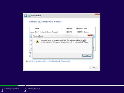 Note: if you enabled UEFI in BIOS, you cannot install Windows 11 on a MBR disk until deleting all existing partitions. If you install Windows 11 on MBR disk with an existing partition, you'll receive error message "Windows can't be installed on this disk. The selected disk has an MBR partition table. On EFI system, Windows can only be installed to GPT disks.".